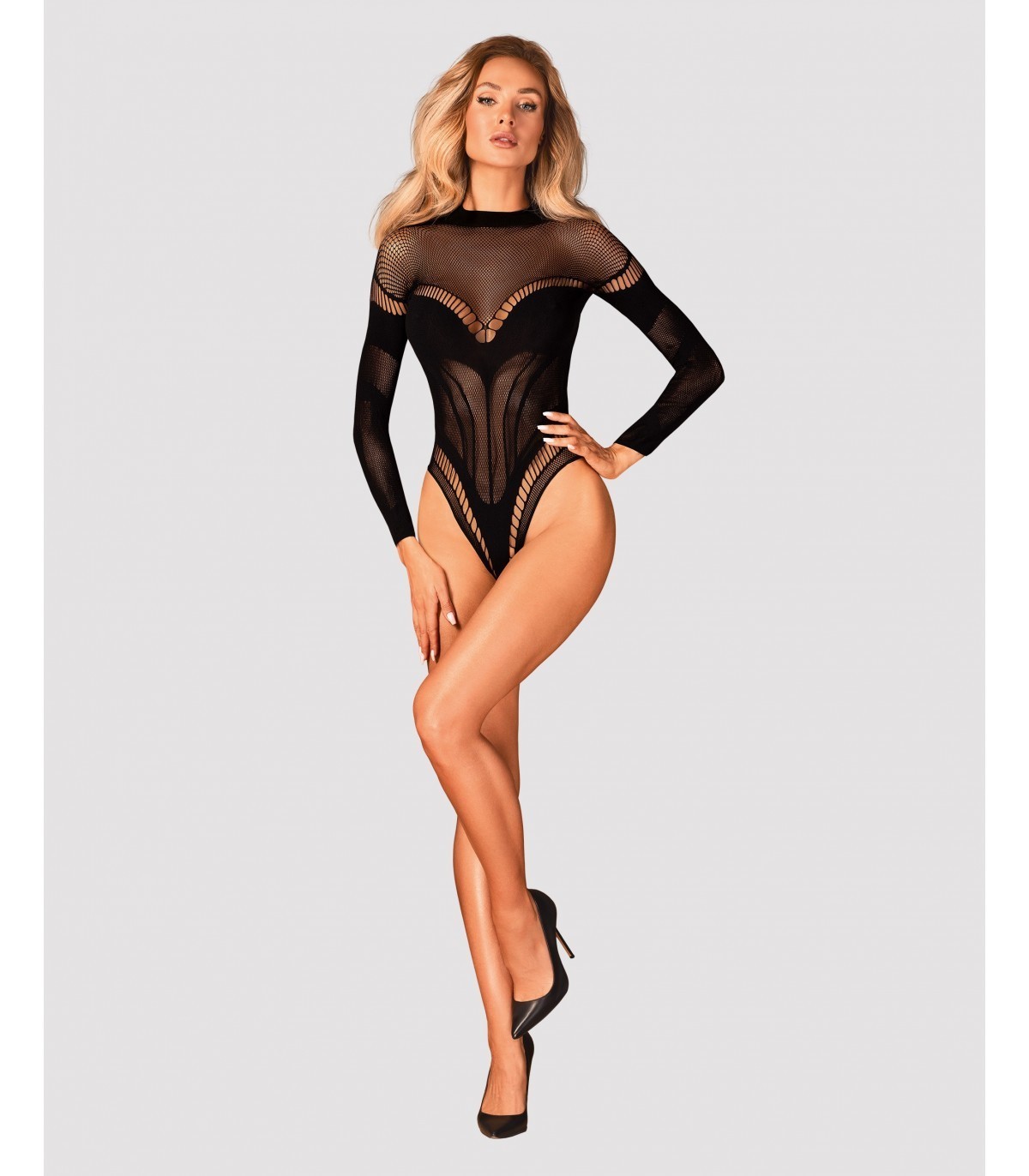 «Sexy osito de peluche hecho de una tela agradable. Los adornos geométricos caen perfectamente sobre el cuerpo, enfatizando sus ventajas. El corte intrigante en la espalda llama la atención y agrega atractivo sexual. La entrepierna abierta es un elemento picante que seguramente agregará un ambiente cálido a la noche. .