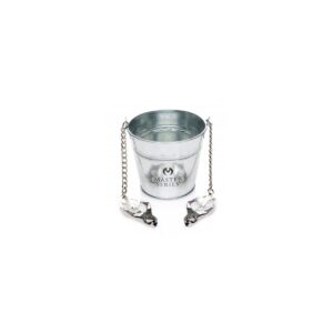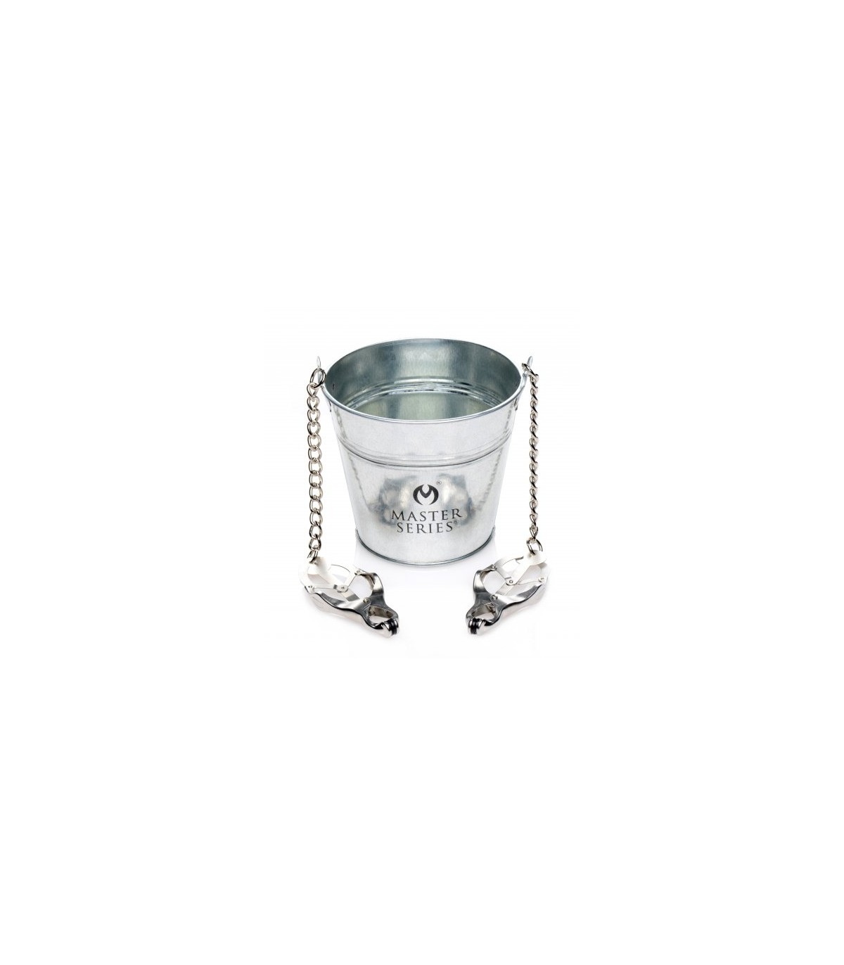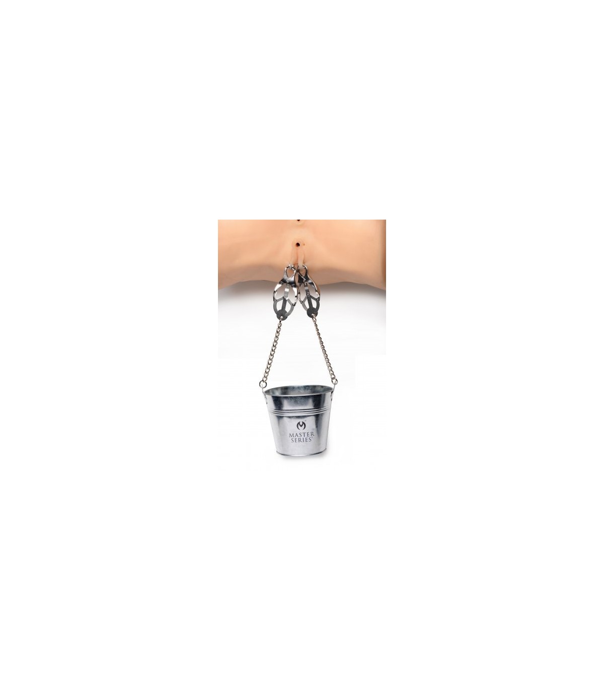 Conjunto de dos pinzas unidas por una cadena metálica que sujeta un cubo metálico.